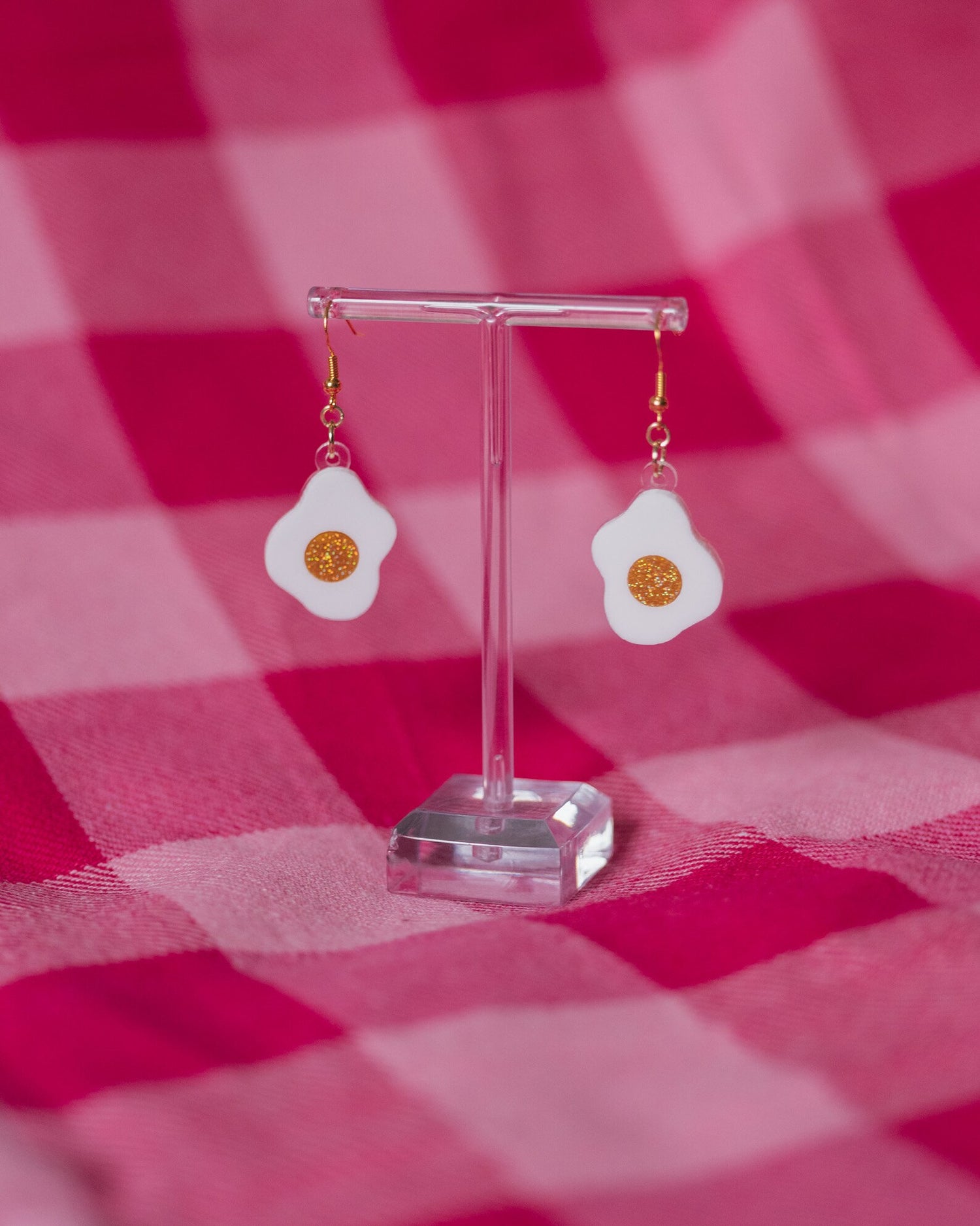 As we all know, eggs are IN. Whether you take them scrambled, over hard, poached, or sunny side up, we can agree that they are delightful. In a shop named Club Eggie, it would be criminal to not provide the egg content she knows ya'll crave. These Itty Bitty Egg earrings are sparkly, stunning, and just the thing to let the world know what you will be eating for breakfast. The yolks are a gorgeous amber sparkle and the hardware is gold colored.