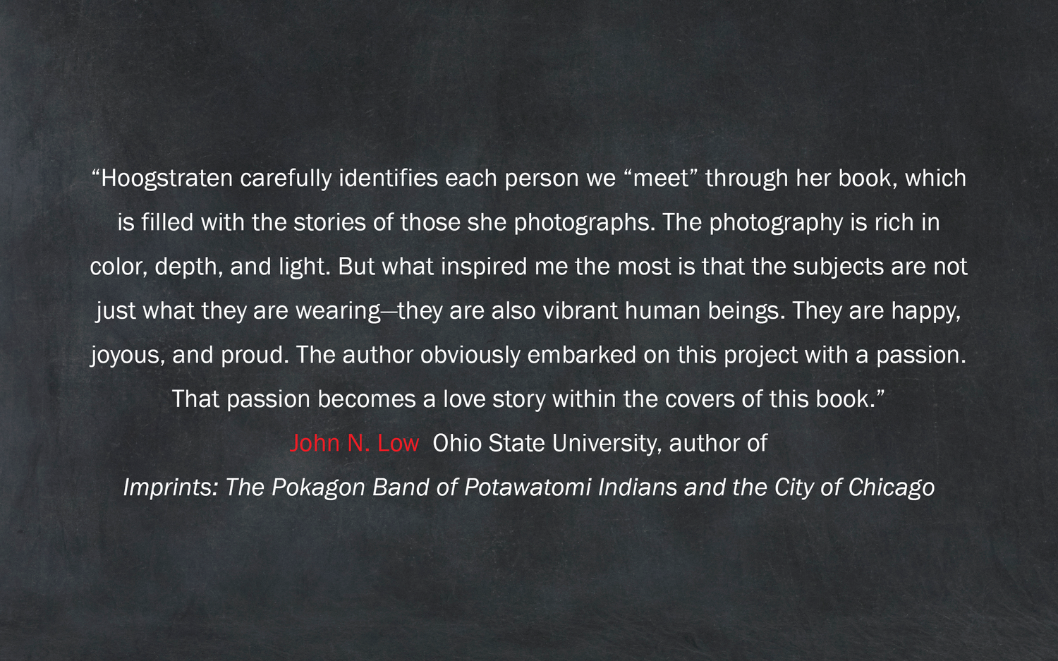 Traveling first to Citizen Potawatomi Nation, her home reservation in Shawnee, Oklahoma, photographer Sharon Hoogstraten called on nine nations of the scattered Potawatomi Tribe. The resulting monograph of contemporary Powatatomis illustrates traditional regalia adapted to reflect the influence and storytelling of their present-day lives; proud descendants who live in a country of assimilation, sewing machines, polyester fabrics, duct tape, tattoos, favorite sports teams, military service, and high resolution digital cameras.