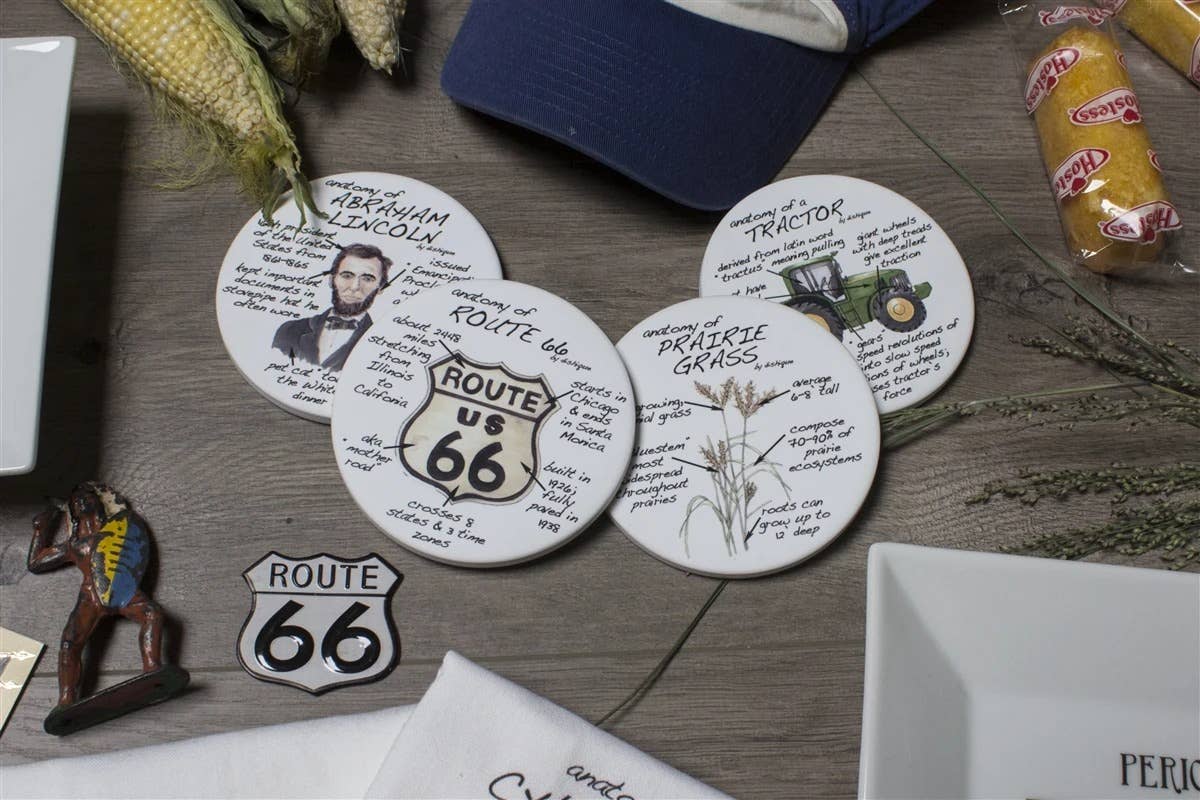 This set includes the Anatomy of Abraham Lincoln, Prairie Grass, Route 66, and Tractor. Backed in cork and bundled with love, these coasters make gift giving a breeze. Learn a thing or 2 the next time you cheers a glass! 4" Sandstone Coasters Backed with cork Bundled together and boxed for easy gifting.