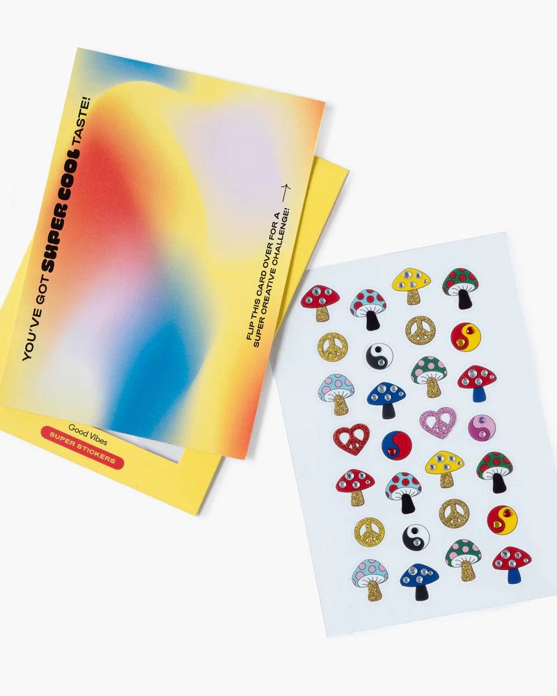 Our Good Vibes single sticker sheet features gem-covered mushrooms, peace signs, and yin-yang symbols in a rainbow of fun colors. Make a card for your BFF or decorate your school supplies. They'll showcase Plus, each sheet comes with its own postcard—a place for you to draw new ideas.