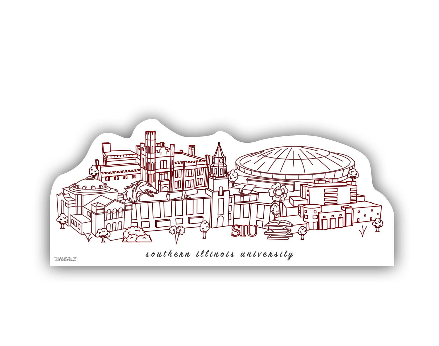 This decal features a birds eye view of the most iconic buildings on the campus of Southern Illinois University. The artist, Townsville Art, spent much needed time on research before illustrating this unique artwork. A student spends over four years interacting with these campus icons and can now continue the memories on their laptop or water bottle.